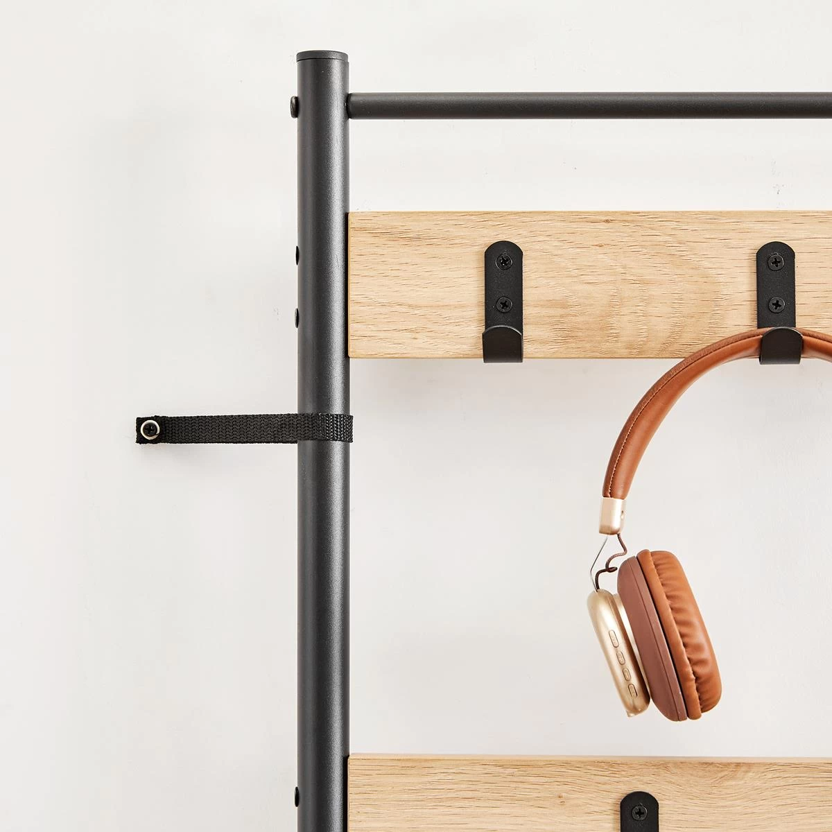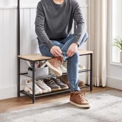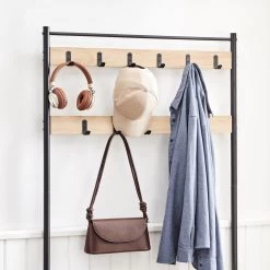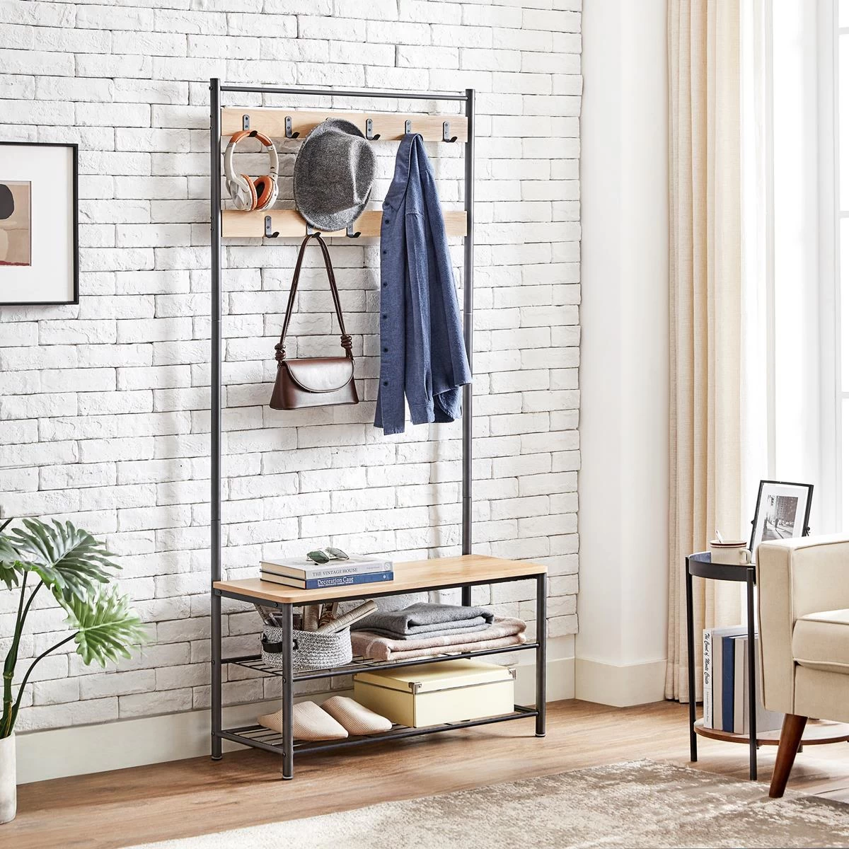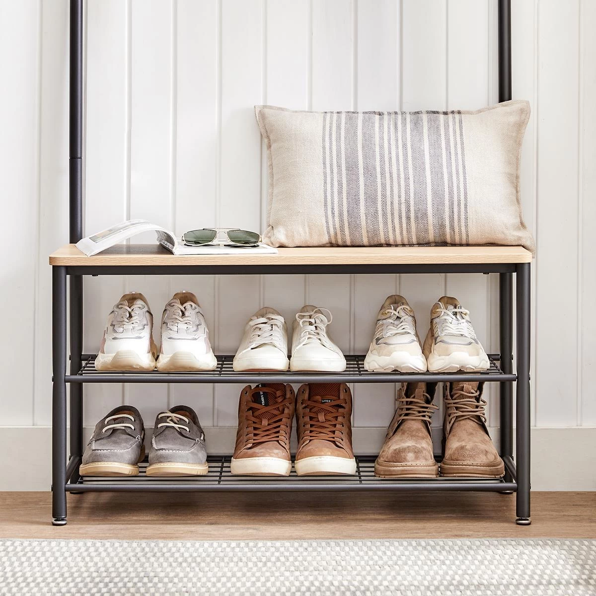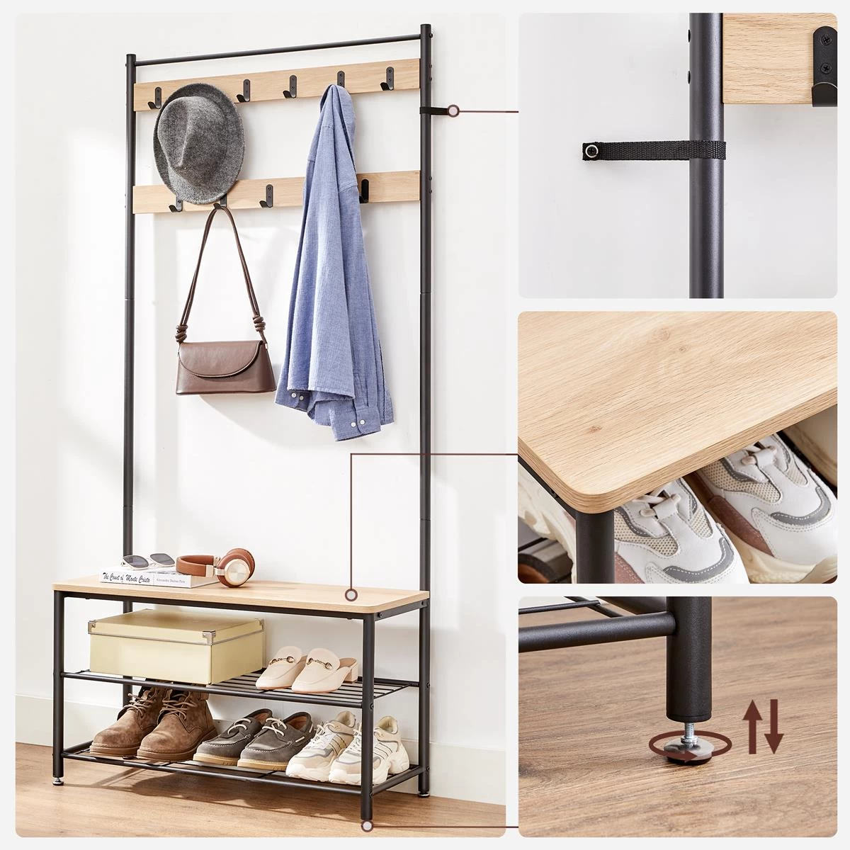 Je kan aan dit garderoberek verschillende jassen, tassen of hoeden kwijt. Op het bankje kan je jouw schoenen aantrekken. En onderaan dit rek heb je tenslotte plaats voor jouw schoenen. Praktisch, niet?