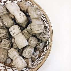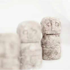 Deze eenvoudige stenen beelden zijn afkomstig van het Indonesische eiland Sumba en zijn met de hand uit zandsteen gehouwen door plaatselijke ambachtslieden. In de traditionele dorpen van Sumba worden beelden als deze geplaatst in en rond de ingang