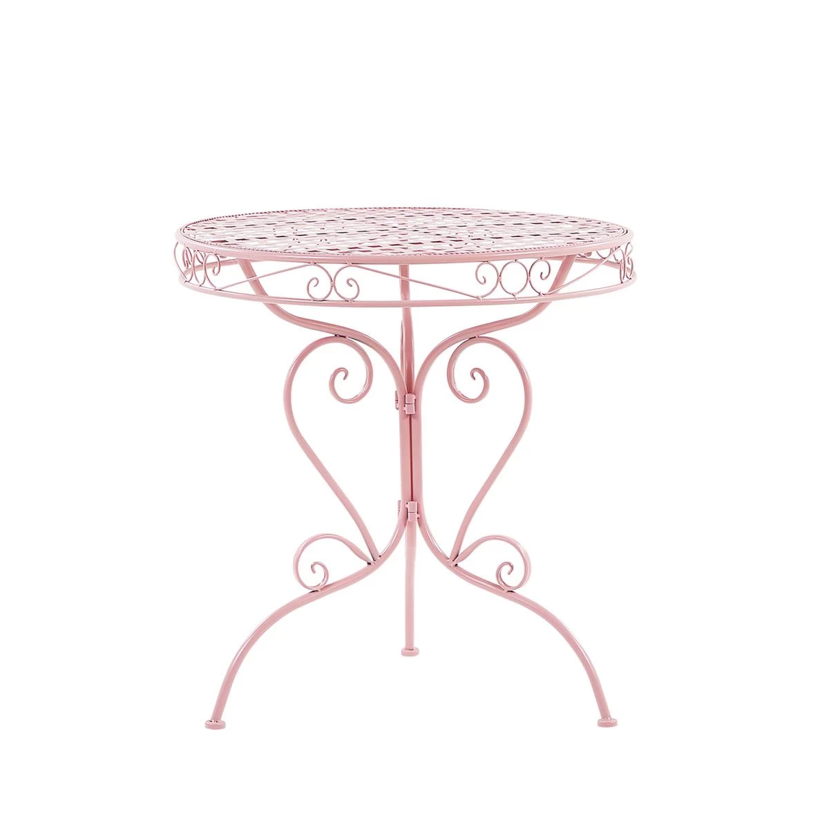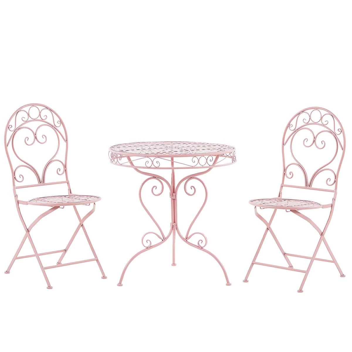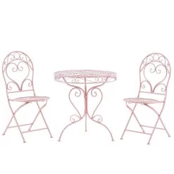 Prachtige 3-delige bistroset met een vintage touch maakt een opvallende toevoeging aan elke tuin of balkon. Het roze, poedergecoate frame met prachtig open scrollwerk straalt een romantische sfeer uit. Gemaakt van ijzer, is deze buiten set gemakkeli
