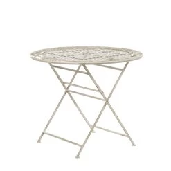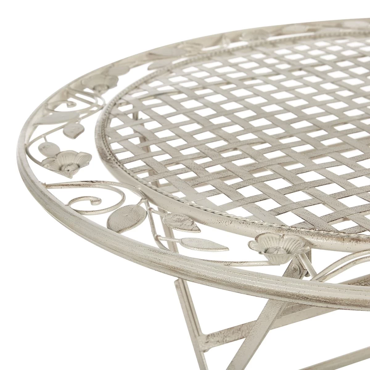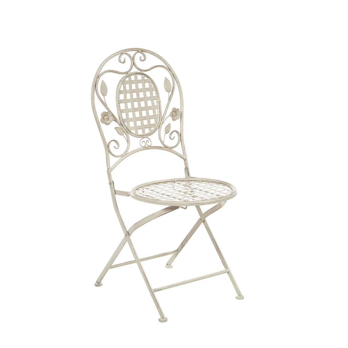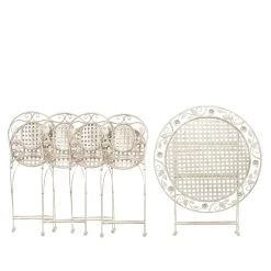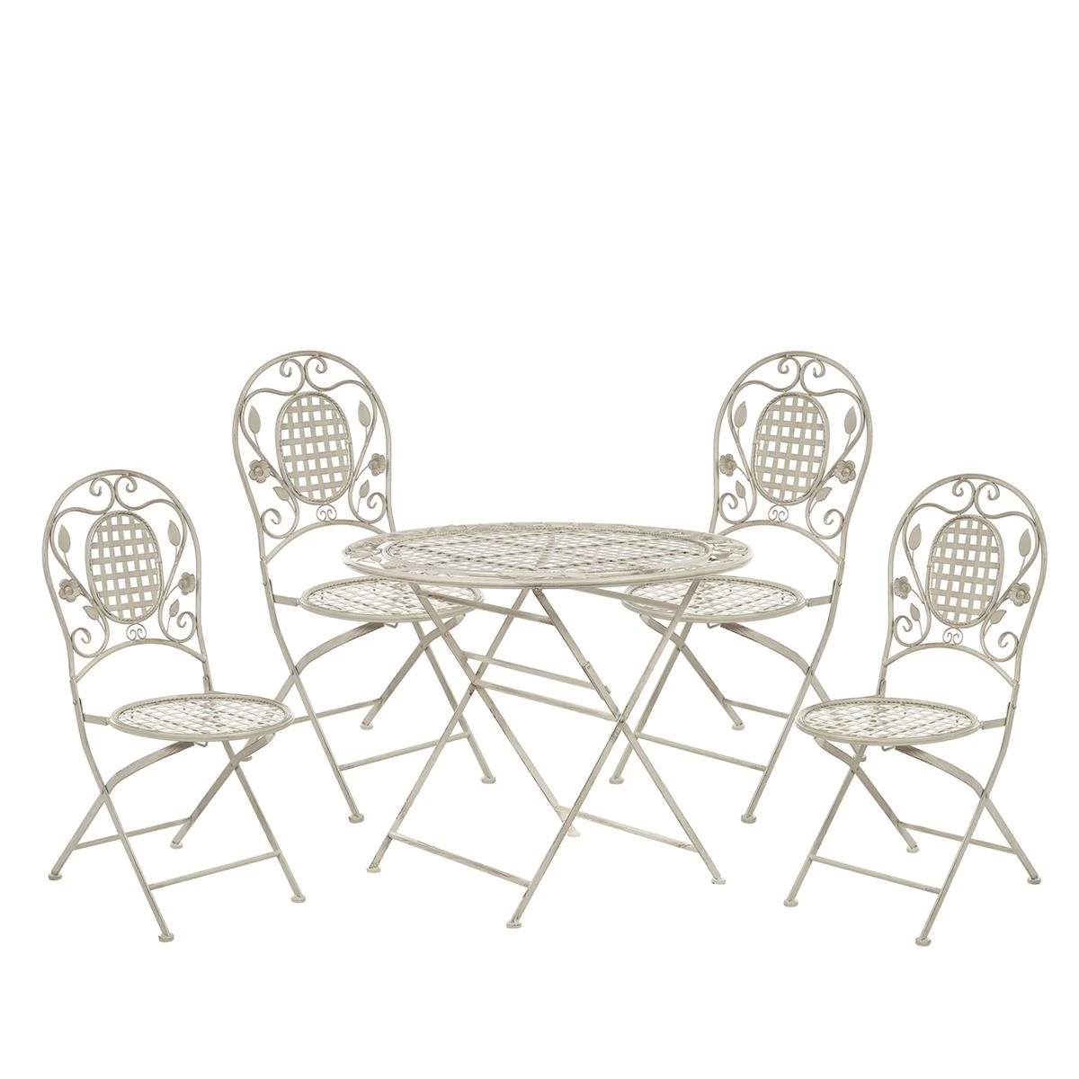 Voeg een vleugje Provençaalse stijl toe aan je balkon of tuin met deze elegante tuinset. Het tuinset is gemaakt van gepoedercoat ijzer en heeft een verweerd effect en een opengewerkt ontwerp met bloemenornamenten. De tuinset bevat vier stoelen en ee