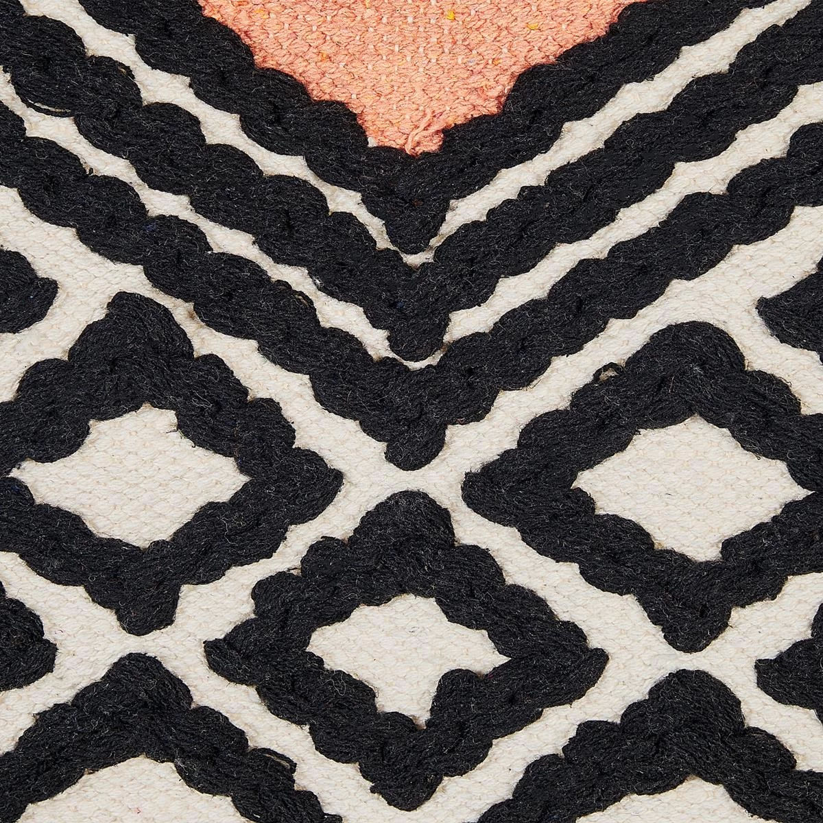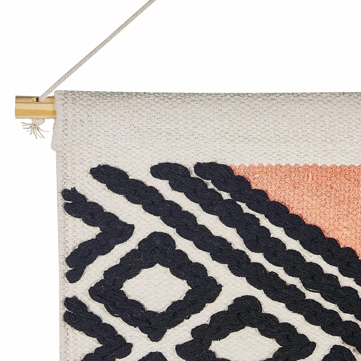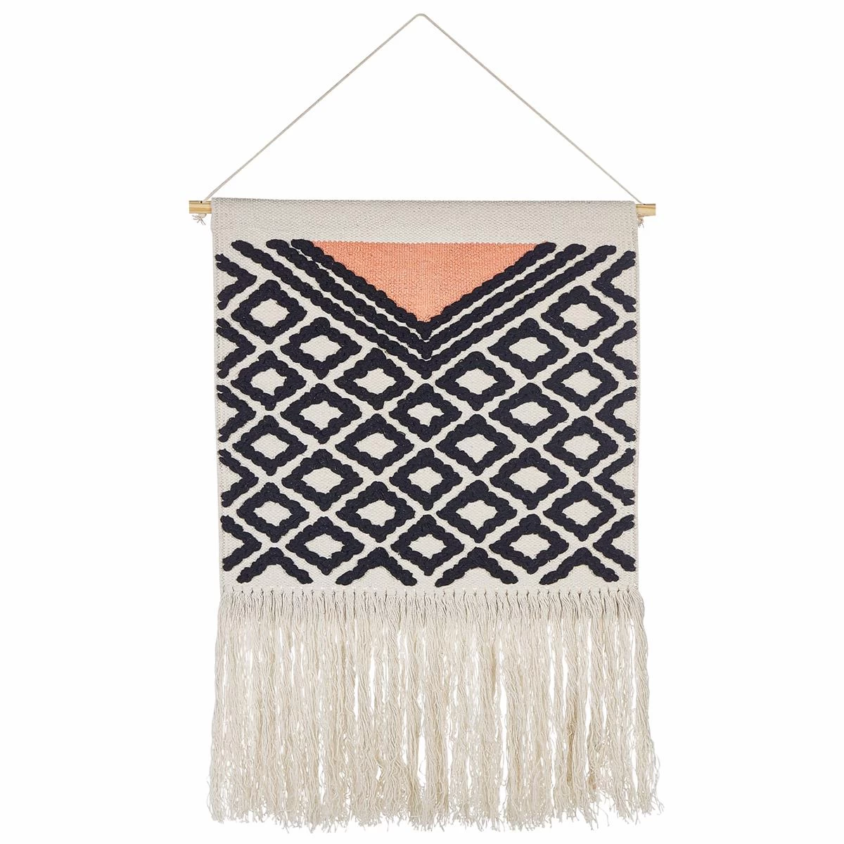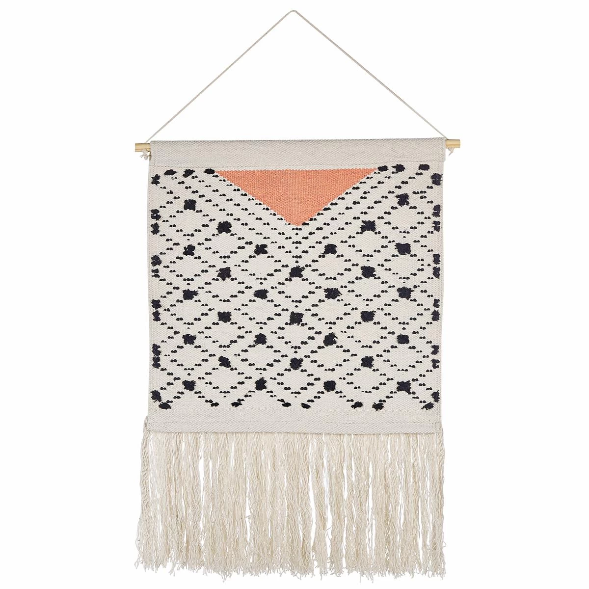 Dit eenvoudige maar zeer decoratieve stuk kan het ontwerp van elke kamer mooi versterken. Het geometrische patroon en de decoratieve kwastjes geven deze decoratie een boho-gevoel, en het oranje accent fleurt het ontwerp op, waardoor het een echte bl