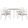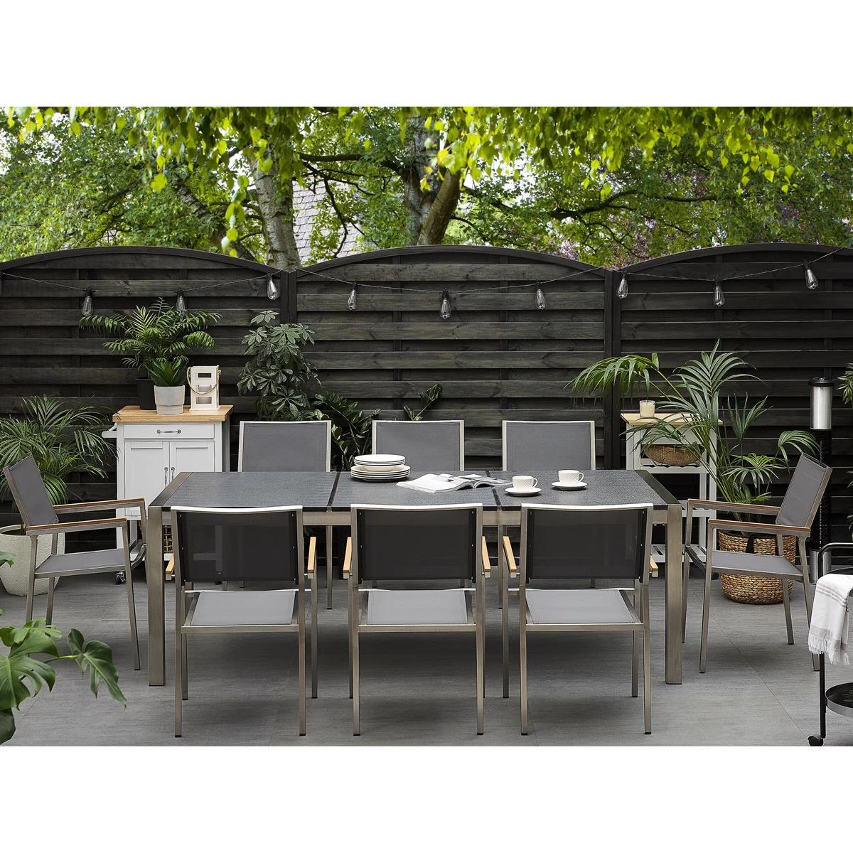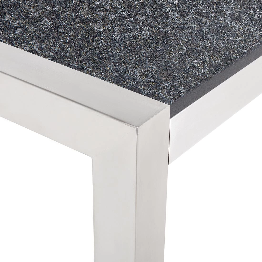 Een exclusieve tuinset die een stijlvolle touch geeft aan je tuin of terras. Met een mooie combinatie van roestvrij staal en glas voor een moderne uitstraling. Het tafelblad is weerbestendig en de lichte kleur past perfect bij de zilveren contouren.