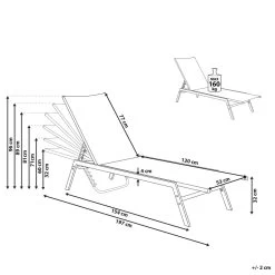 Belangrijkste eigenschappen: Rugleuning verstelbaar in 6 posities, Zeer comfortabel, Onderhoudsvriendelijk en duurzaam materiaal, UV-bestendigheidsklasse 5 (ISO 105-B02), Stabiele afwerking