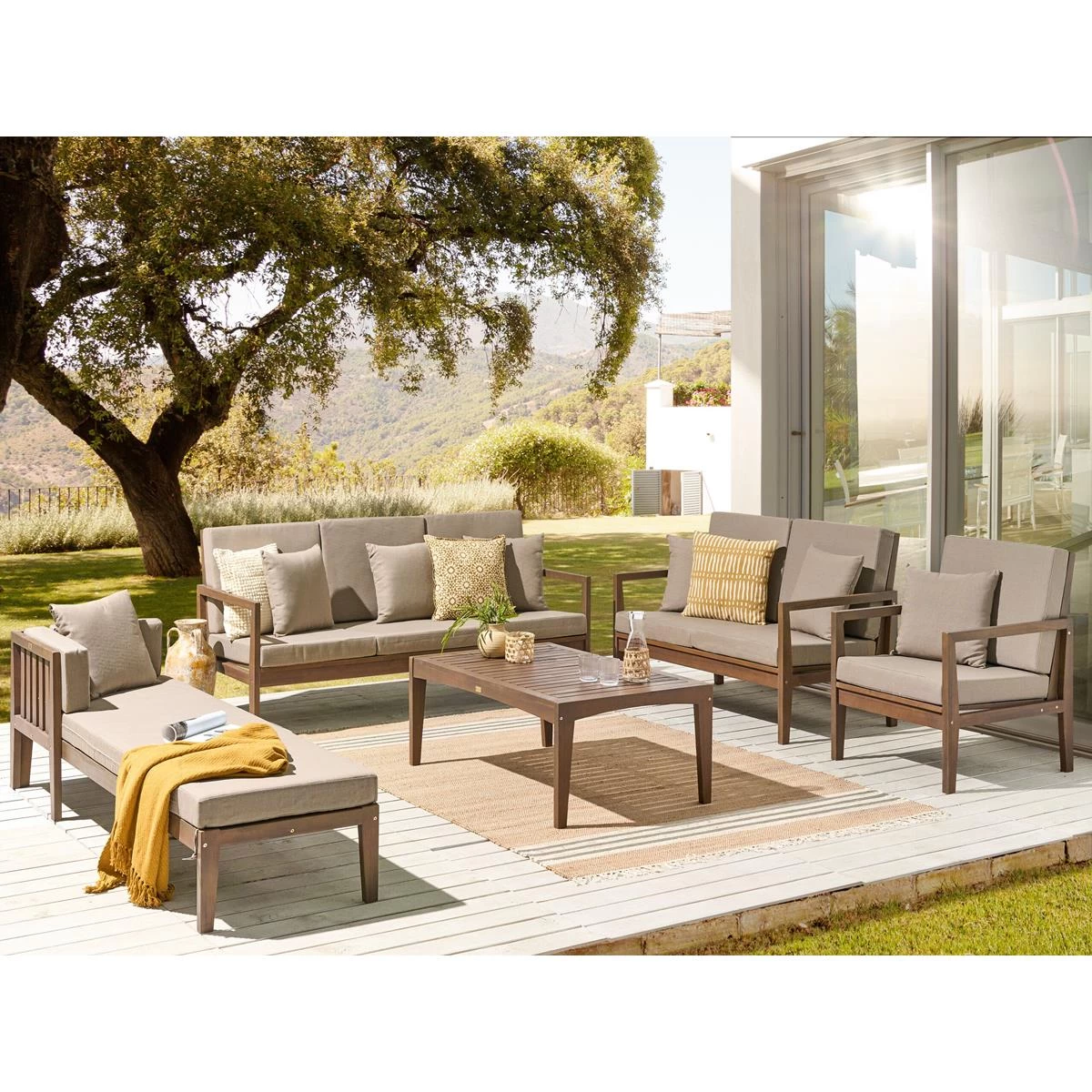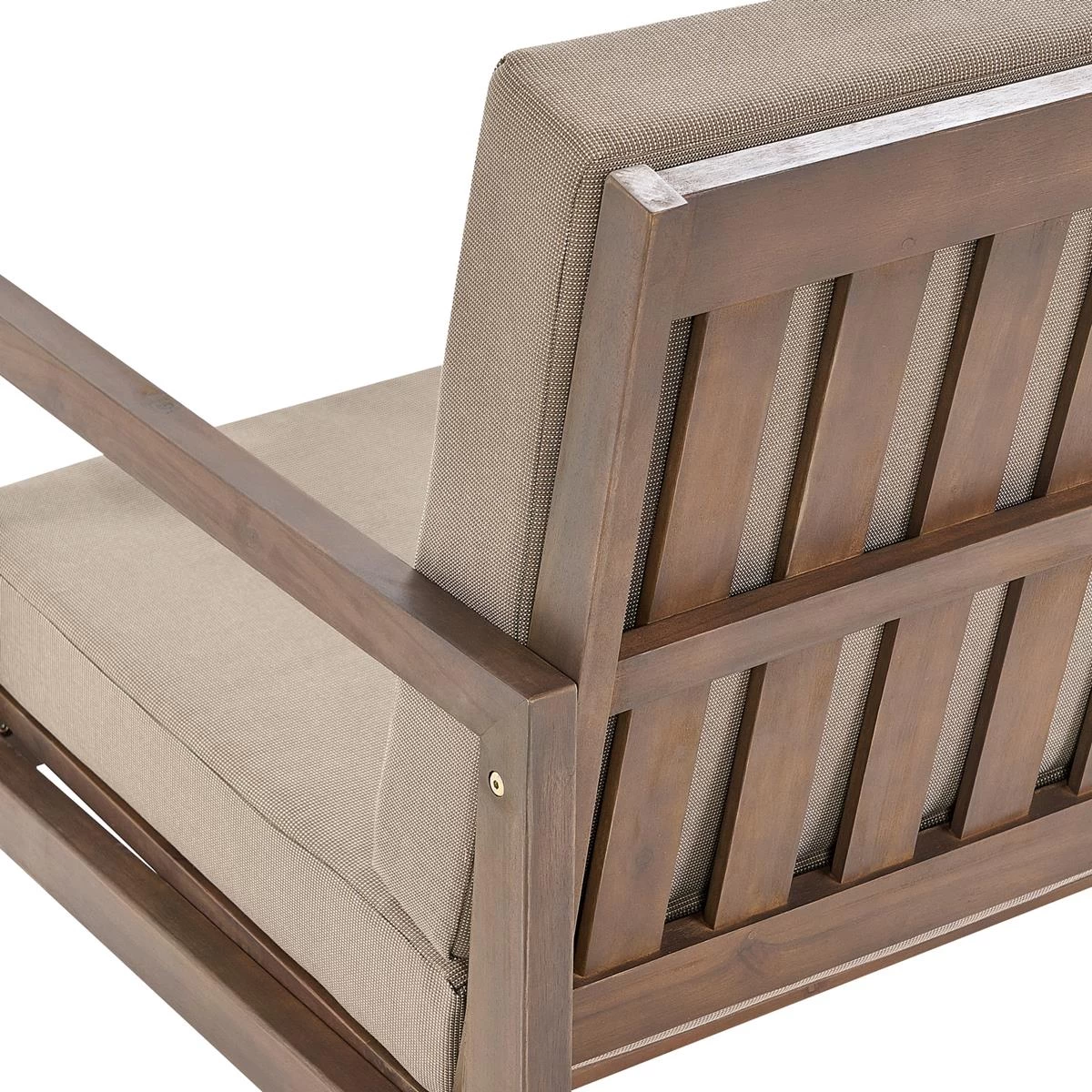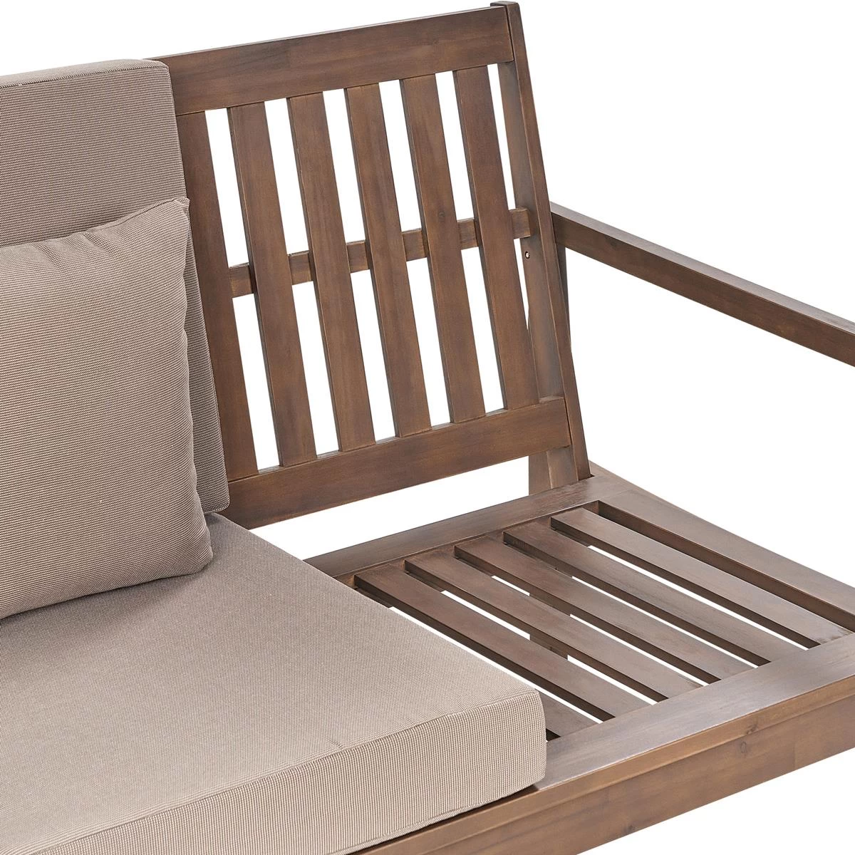 Belangrijkste eigenschappen: Modern terras- en tuinmeubilair, De natuurlijke houtnerven en kwasten maken elk stuk uniek, Robuust frame, UV-bestendigheidsklasse 3 (ISO 105-B02), Verwijderbare kussenhoezen