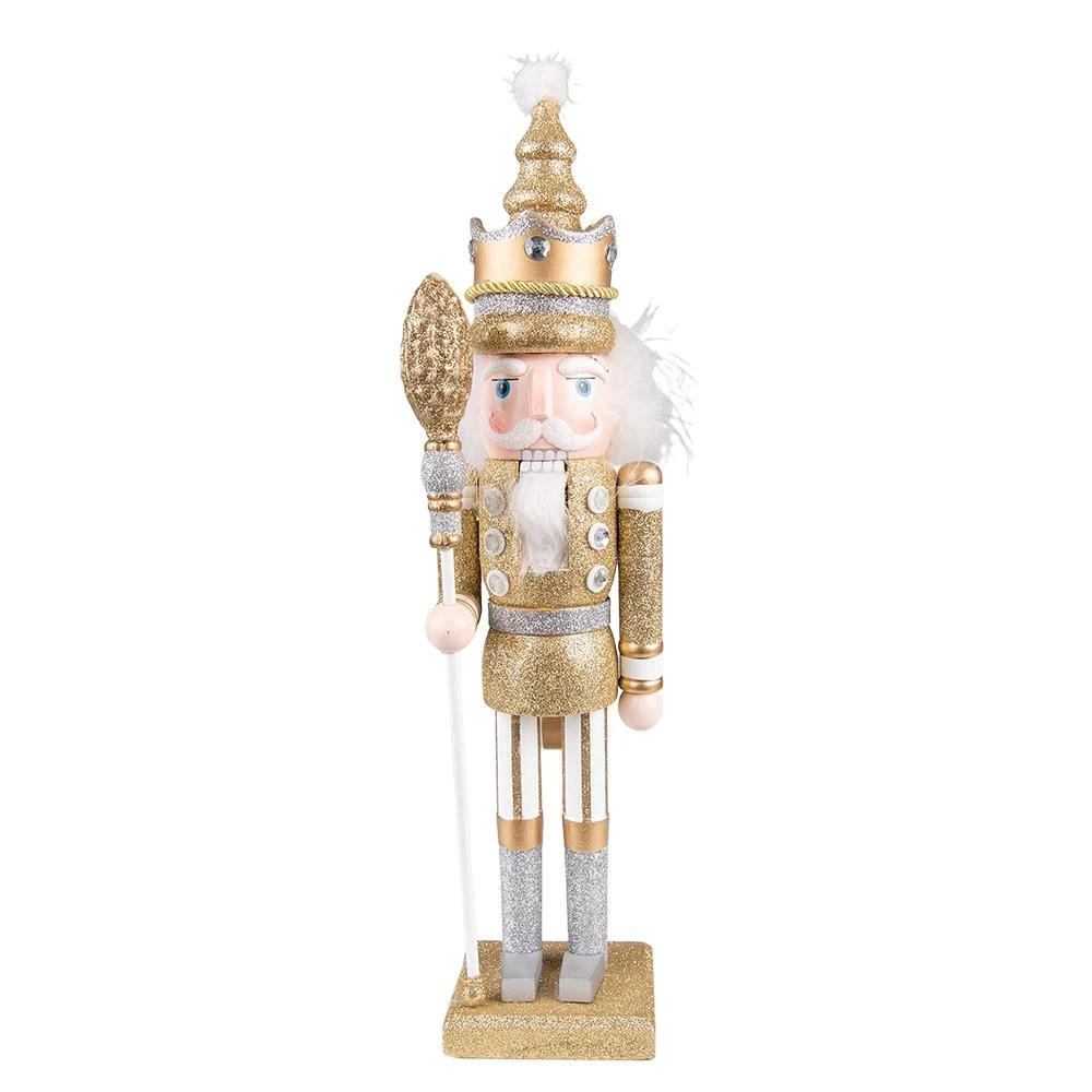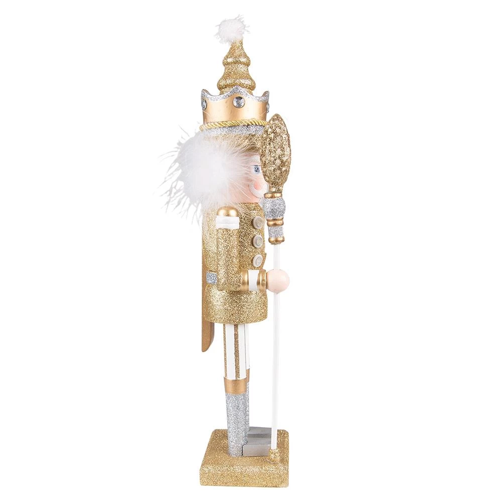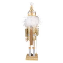 Maak de woonkamer nog gezelliger tijdens kerst met dit decoratieve goudkleurige beeldje van een notenkraker met een scepter in zijn hand, gemaakt van polyresin, in een klassieke stijl, van het merk Clayre & Eef. Afmeting 10x8x42 cm.