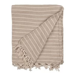Mooie katoenen beige gestreepte deken. Ideaal voor koele avonden. Een praktisch en decoratief element in elk interieur. Vanwege de sterke geur van chemische stoffen raden we aan om de deken eerst in de wasmachine te wassen zonder droger te gebruiken.