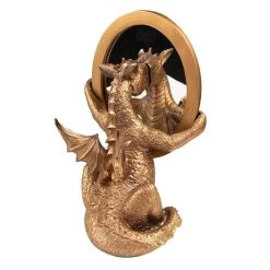 Goudkleurige beeld in de vorm van een draak die een spiegel vasthoudt, gemaakt van polyresin. 16x13x25 cm (afmeting spiegel 15×11 cm).