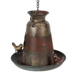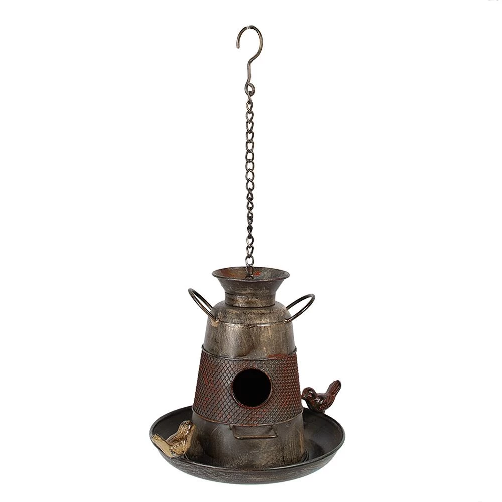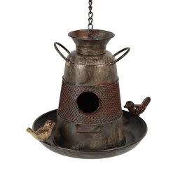 IJzeren vogelhuisje in grijs-rode kleuren. Makkelijk op te hangen, in de vorm van een kan, vormt het een prachtige decoratie voor elke tuin.