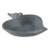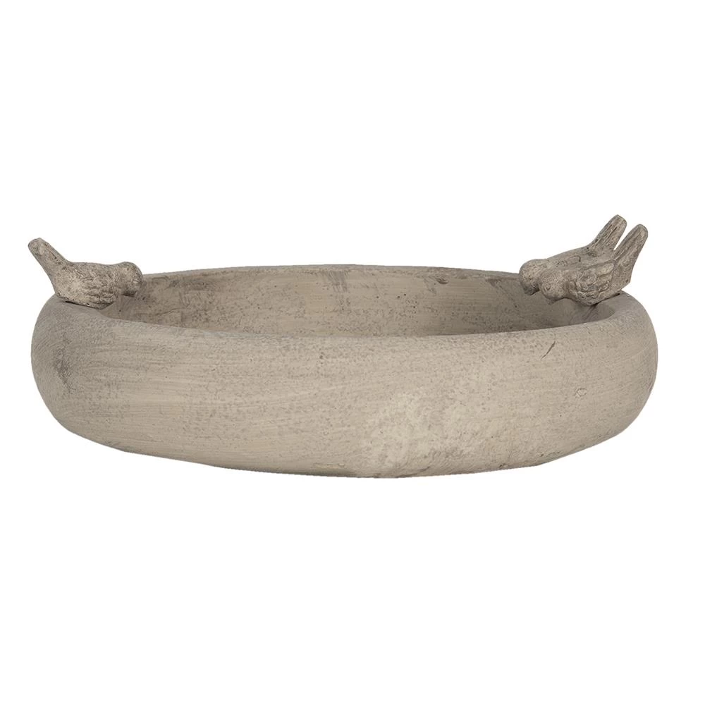 Decoratieve grijze stenen vogelvoederbak, met op de rand drie vogeltje, in landelijke stijl. Niet waterdicht.