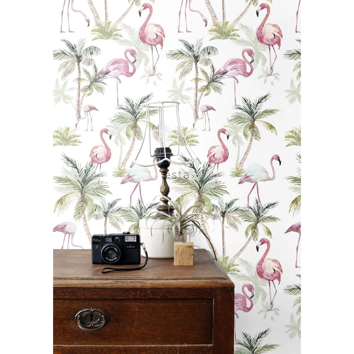 Dit hippe behang met flamingo’s in roze zorgt het hele jaar door voor een tropische vibe in huis en past helemaal bij de tropisch-botanische look. Wil je de look compleet maken? Combineer dit behang dan met lichte kleuren, natuurlijke materialen en n