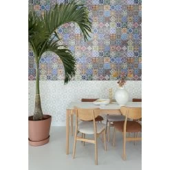 Dit geweldige behang met spaanse tegels in blauw, oranje, groen en beige maakt van je muur een echte eye-catcher en geeft veel sfeer in huis.Afmetingen, herhaling en aansluitingDe afmetingen van deze XXL behang zijn 50 x 90