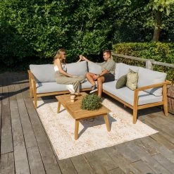 Als iemand het verdient om in het zonnetje gezet te worden, dan is het deze Lucca set van Exotan wel. In de eerste plaats natuurlijk vanwege het mooie teakhout van de stoelen, bank en tafel, maar ook de comfortabele Olefin kussens dragen eraan bij!