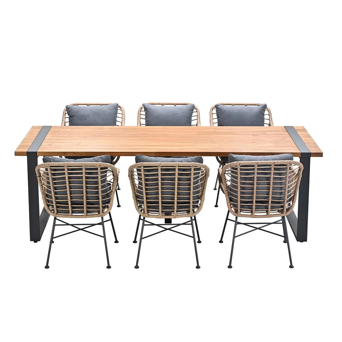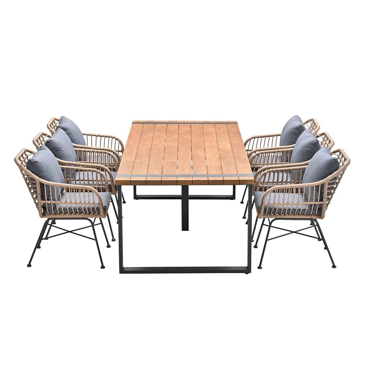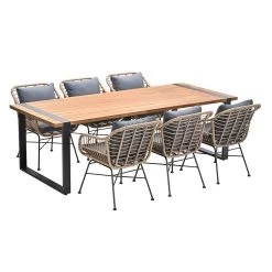 De Lucas tuinstoel heeft een aluminium frame en stalen onderstel. Om het aluminium zit bruin vlechtwerkdraad gevlochten. De tuintafel is gemaakt van teakhout en aluminium heeft een afmeting van 240x100x75 cm. De tuinstoel is 59×69,x82,5 cm.