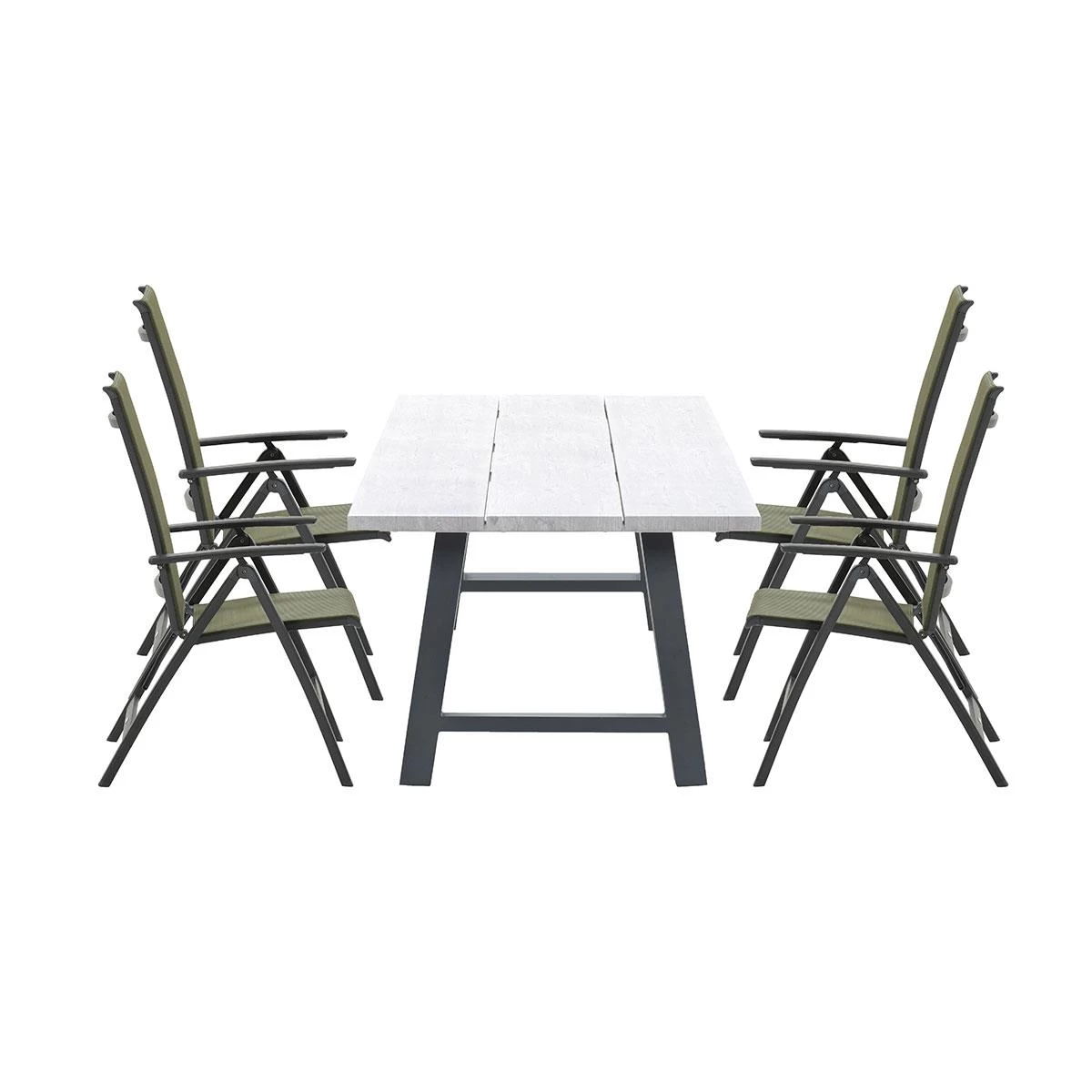 Met de Santana – Leuven tuinset zit je goed. De verstelbare stoel is inklapbaar en licht in gewicht. De tafel is vervaardigd uit aluminium met een blad van teakhout-look. Afmeting stoel: 60 x 70 x 108 cm. Afmeting tafel: 220 x 100 x 74 cm.