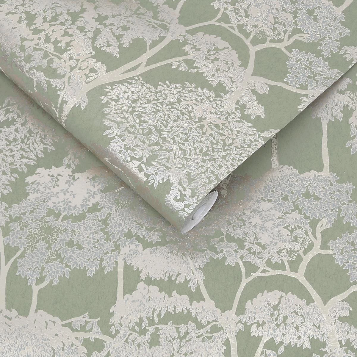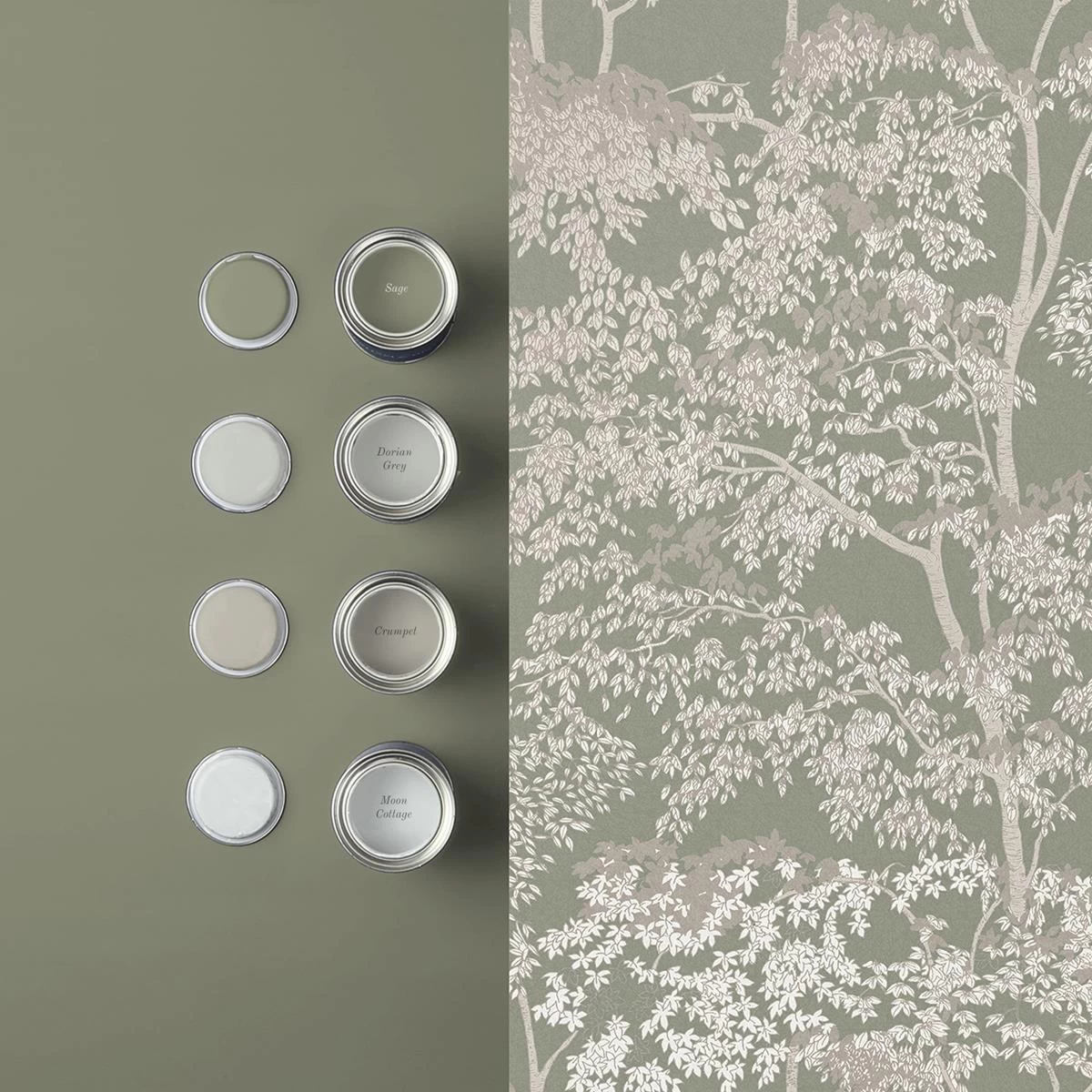 Ranke bomen, geschilderd in champagnekleurig metallic, glinsteren tegen een achtergrond van mat poedergroen op Idyll Tree Sage