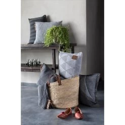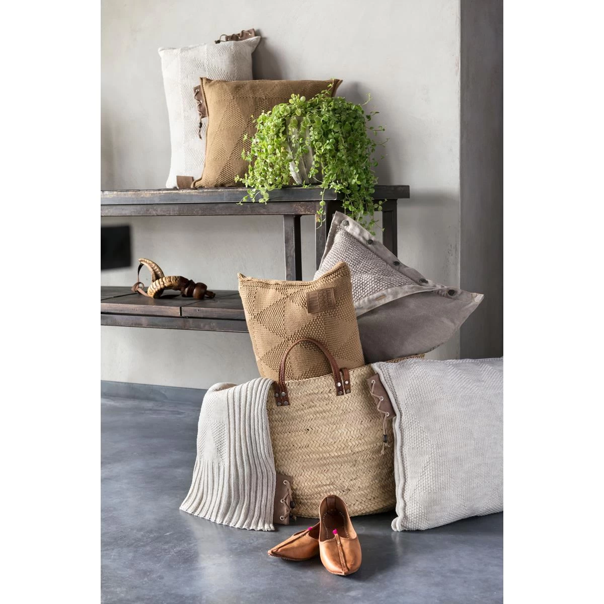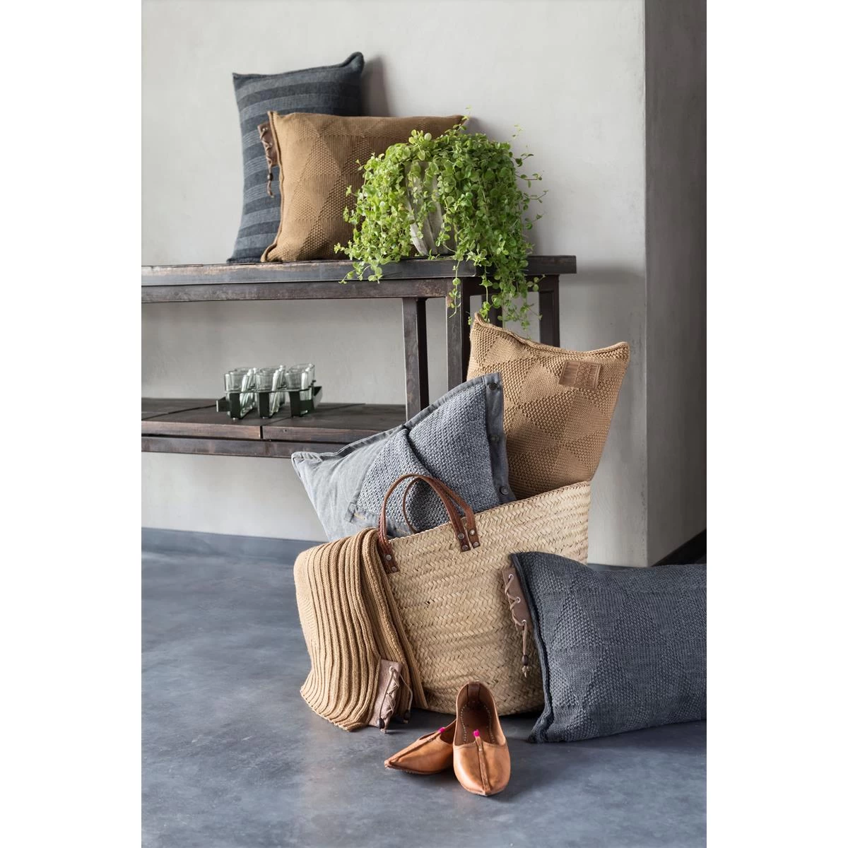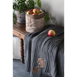 Gebreide plaid met stijlvol design – met een geometrisch breimotief en leerdetail met kralen – een blikvanger op uw bank