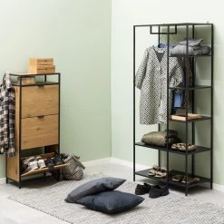 Hoe stoer is de Jaxon van MOOS! Eigenlijk kan jouw interieur niet meer zonder een mooie kast als deze.Het frame is gemaakt van een stevig materiaal en er is veel opbergruimte voor jassen, schoenen, tassen en andere accessoires. Ideaal voor in de hal.