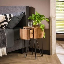 Met het MOOS Teun nachtkastje geef je de slaapkamer een prachtige uitstraling. Dit ronde kastje heeft een compact formaat, maar is handig om er allerlei spullen op te zetten. Met de verborgen lade creëer je nog wat extra opbergruimte.