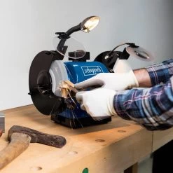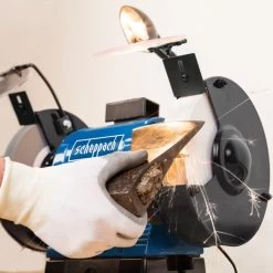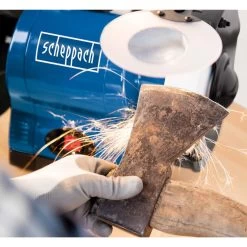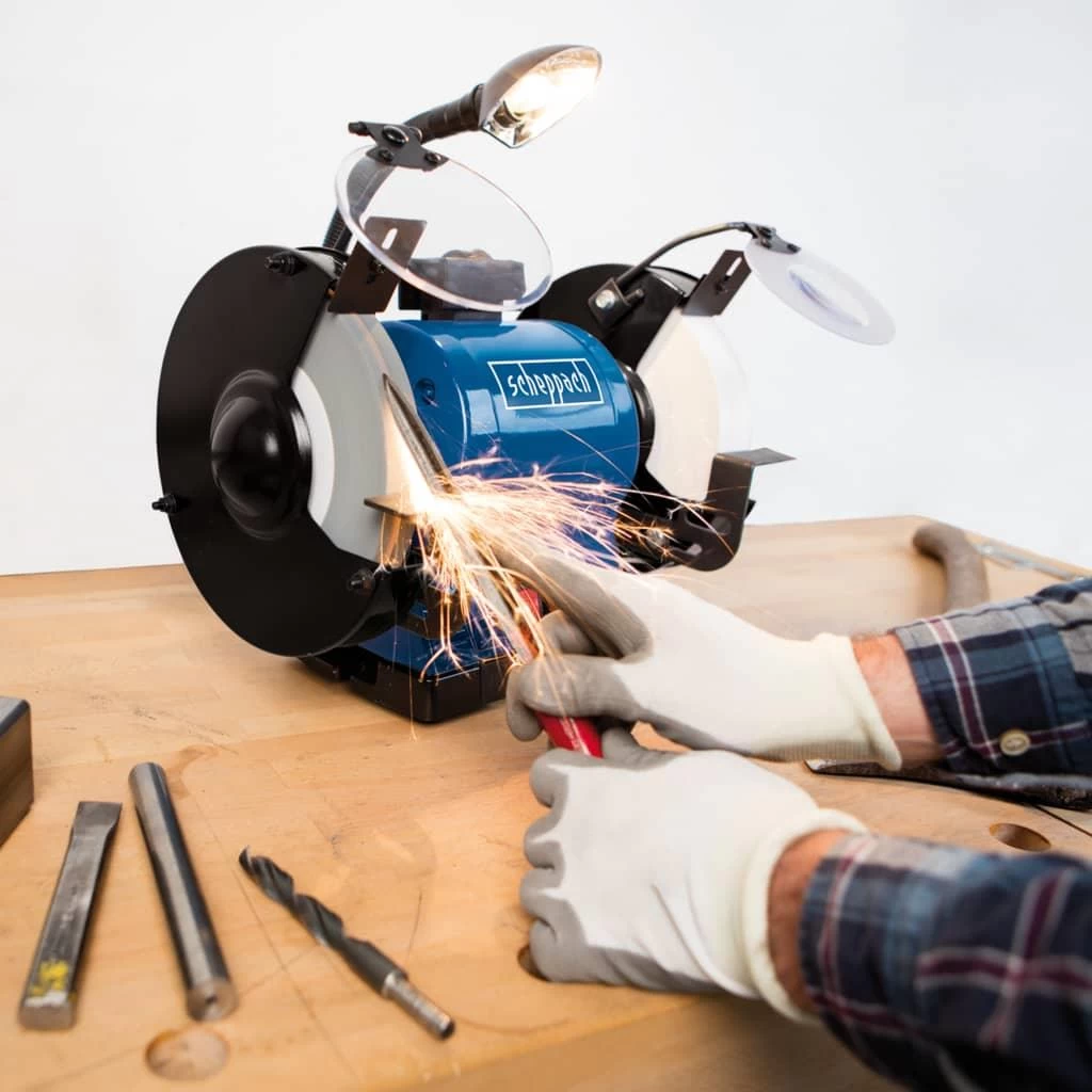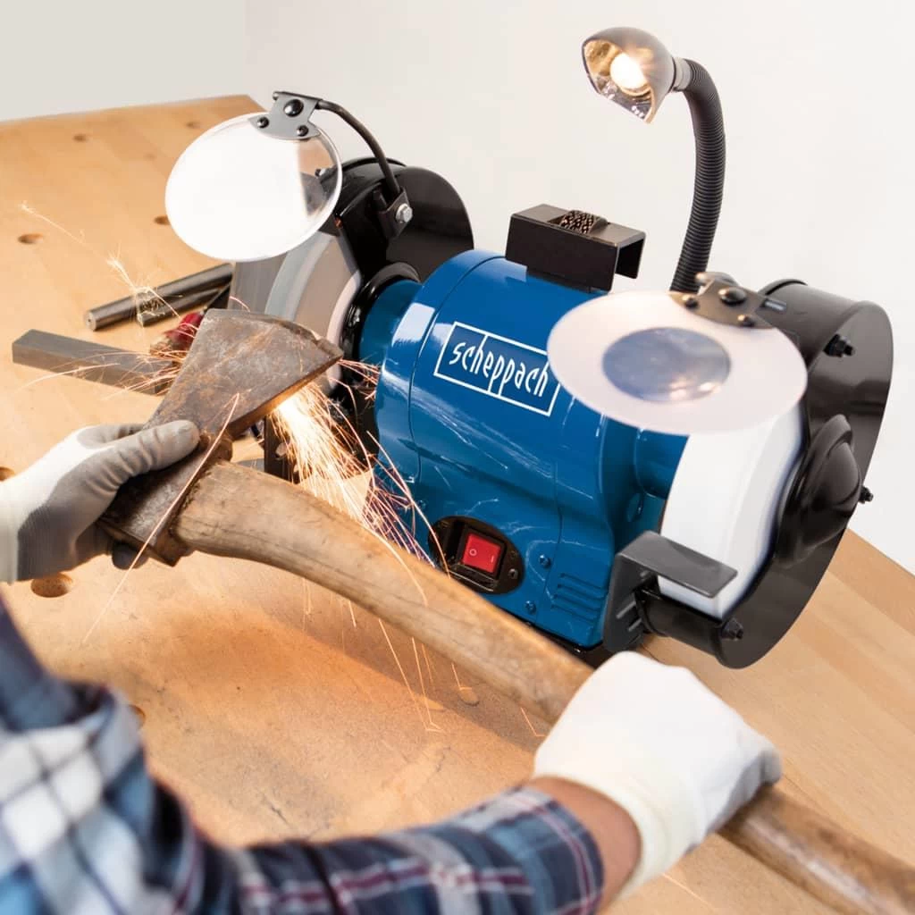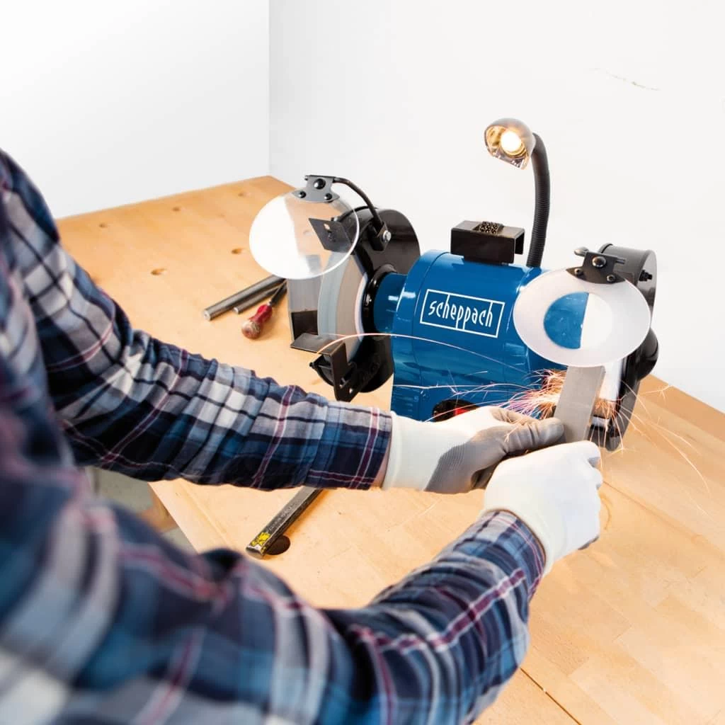 Deze BG200AL slijpmachine van Scheppach is perfect voor diverse klussen, waaronder ontbramen, ontroesten, vormgeven, polijsten en slijpen van je snijgereedschap.