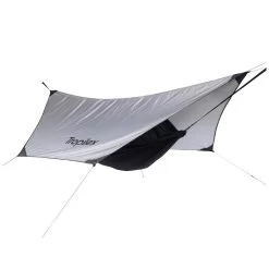 Droog slapen in je hangmatTrek jij er graag op uit met je hangmat? Met deze extra grote Tarp slaap je vanaf nu droog in je hangmat.De Tarp hang je gemakkelijk op met de bijgeleverde extra lange