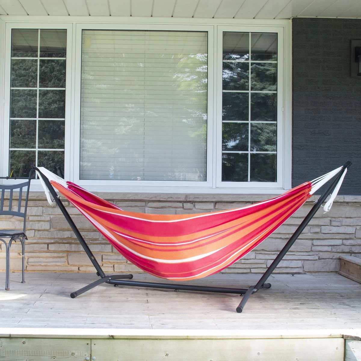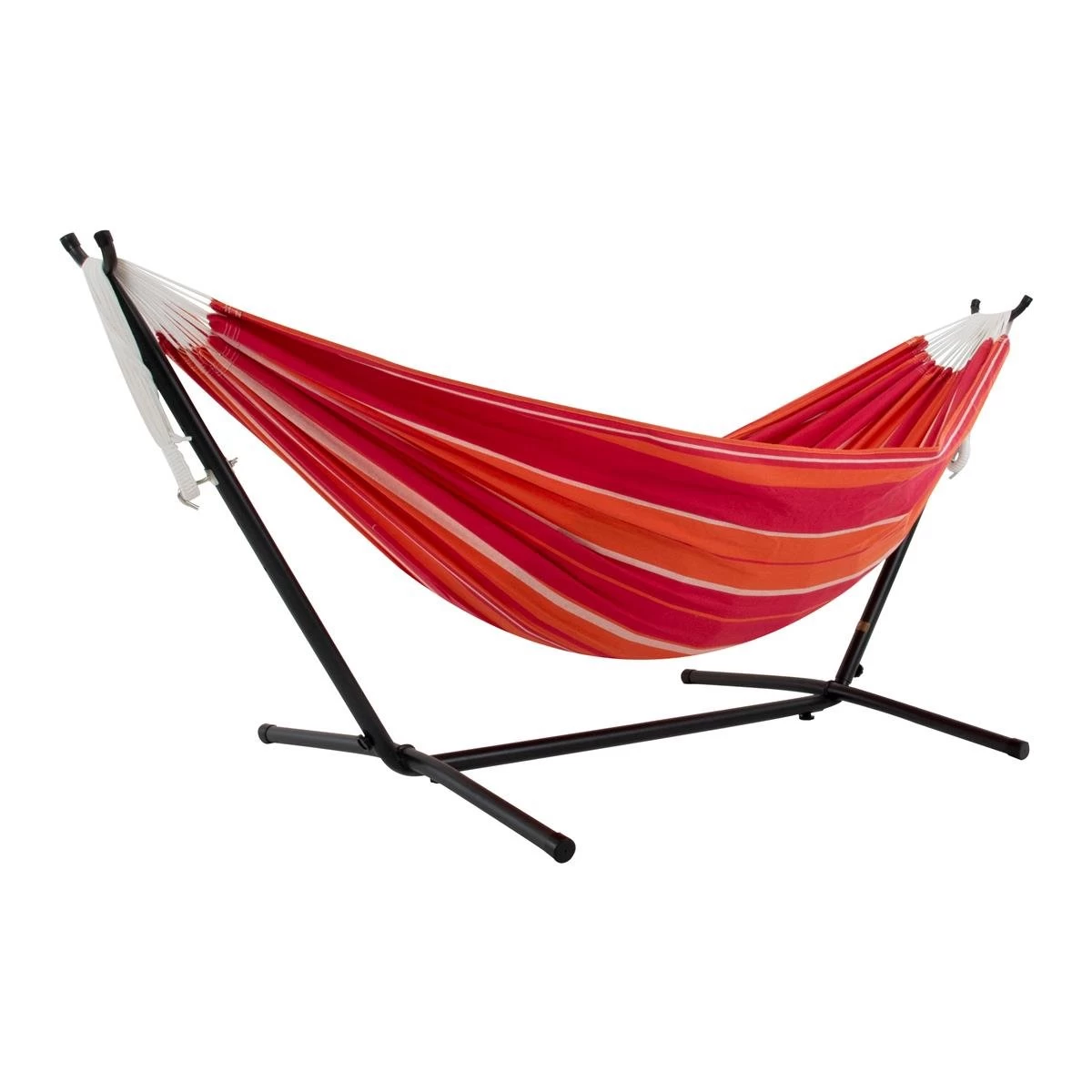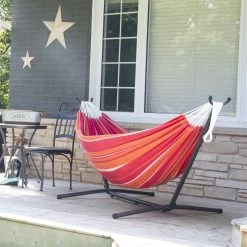 De Vivere Combo tweepersoons hangmat biedt ruimte aan twee personen zodat je samen kunt ontspannen, maar je kunt hem natuurlijk ook helemaal voor jezelf claimen! De vrolijke kleuren van het stevige katoenen doek brengen direct de zomer in je tuin.