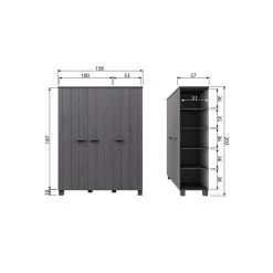 Het interieur van de kast bestaat uit (hanggedeelte) één brede legplank van 100 cm met daaronder een roede en (leggedeelte) 4 legplanken van 53 cm breed. Deze 3-deurs kast Dennis heeft een gewicht van 96,6 kg.