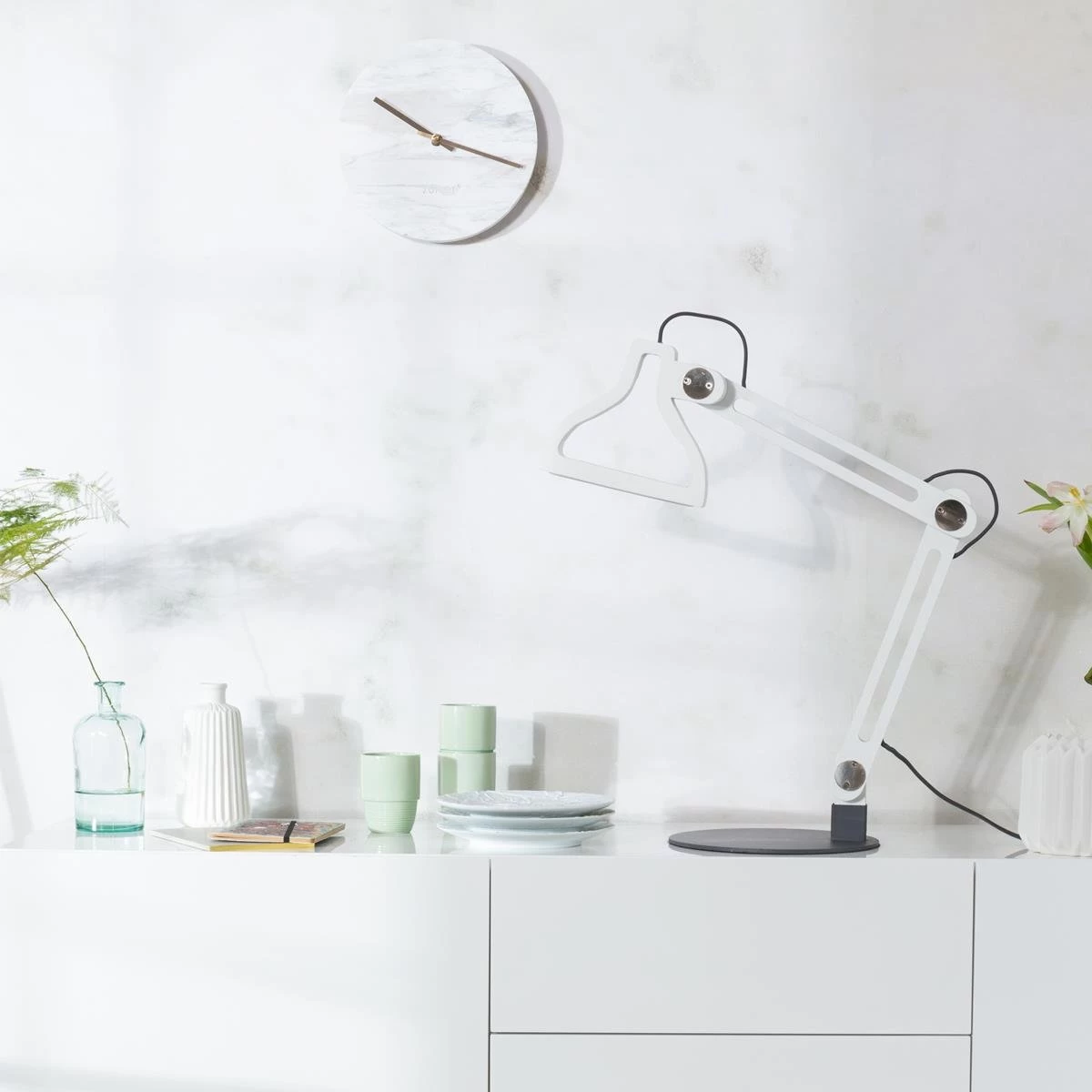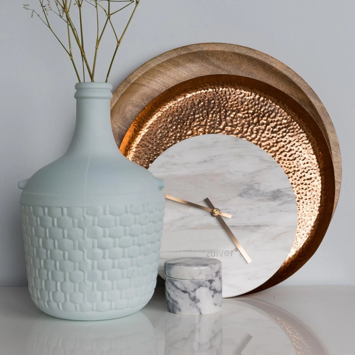 Marmer en koper: a match made in heaven! De Zuiver Marble Time wandklok bezit deze bijzonder mooie combinatie. Een klassieke en veelzijdige klok met een warm accent. Tip: Combineer de klok met andere koperen en marmeren accessoires in je interieur.